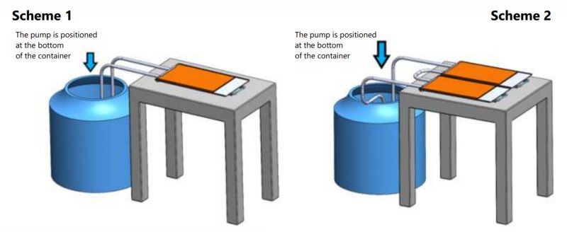 Kalup postavite na ravno površino. Povežite dve cevi z izpustom vode v posodo. Ena cev naj bo povezana s potopno črpalko v posodi z vodo (minimalno 50 litrov) – glejte shemo 1. Temperatura vode...