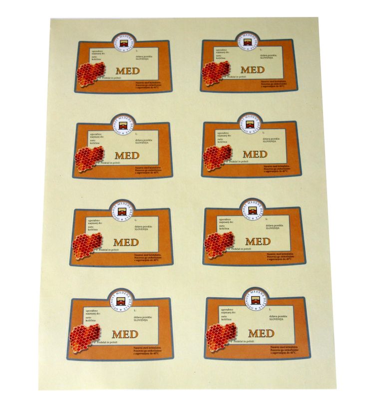Na voljo so samolepilne nalepke za standardni 720 ml kozarec in za kozarec za slovenski med 720, 370 in 212 ml.